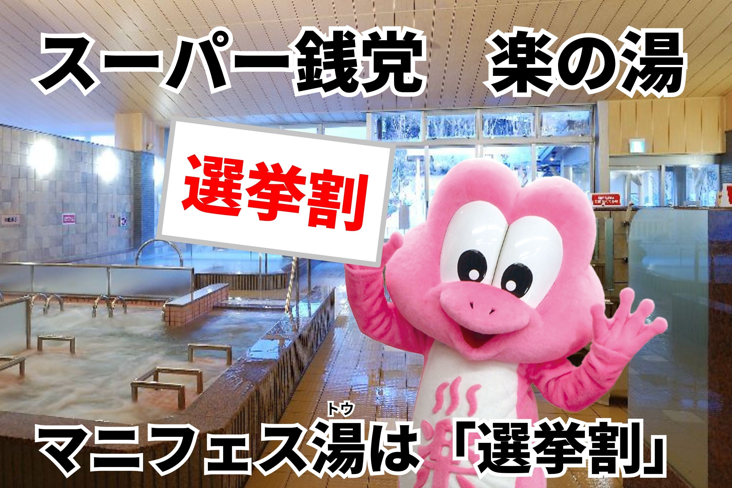 「スーパー銭党」が掲げるマニフェス湯(トウ)は、前回同様「選挙割」です。