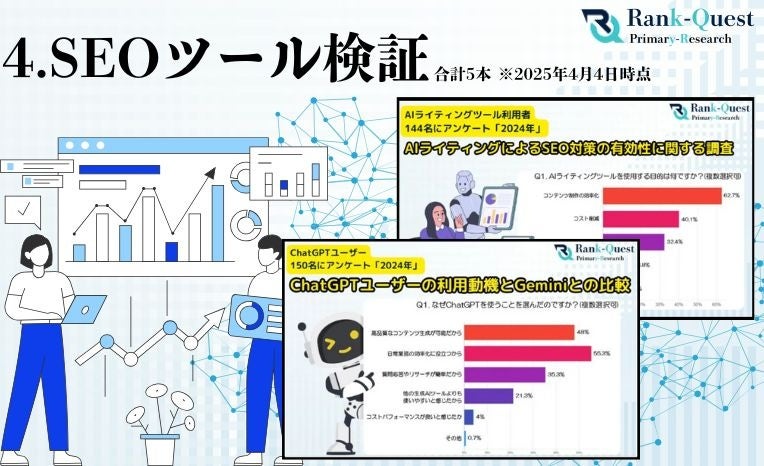 SEOやコンテンツ制作に活用されるAIツールやSEO支援ツールの利用状況・満足度・メリット・課題を調査。具体的な評価や比較データを通じて、各ツールのリアルな有効性を検証します。