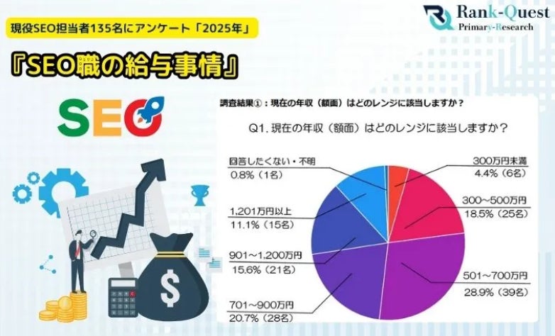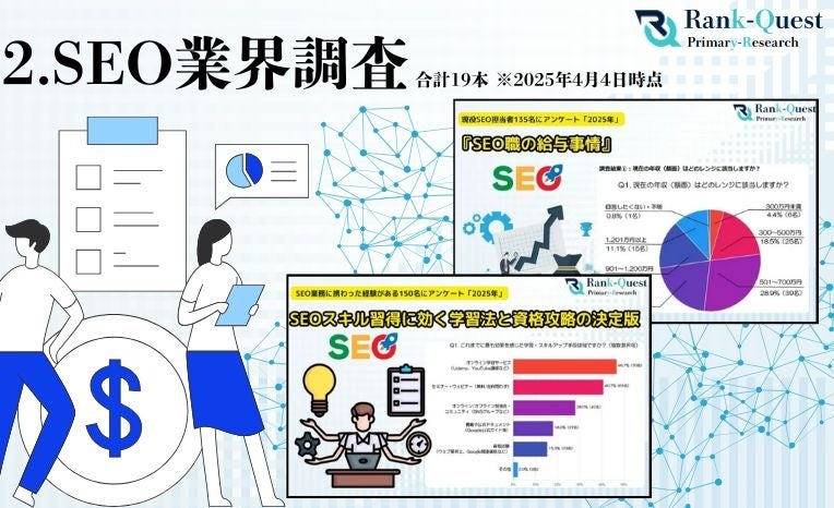 SEO業界の実務者や企業担当者等を対象に、SEO業務におけるスキル、キャリア、給与、チーム編成、ツール利用状況などを深掘りした調査データを提供します。