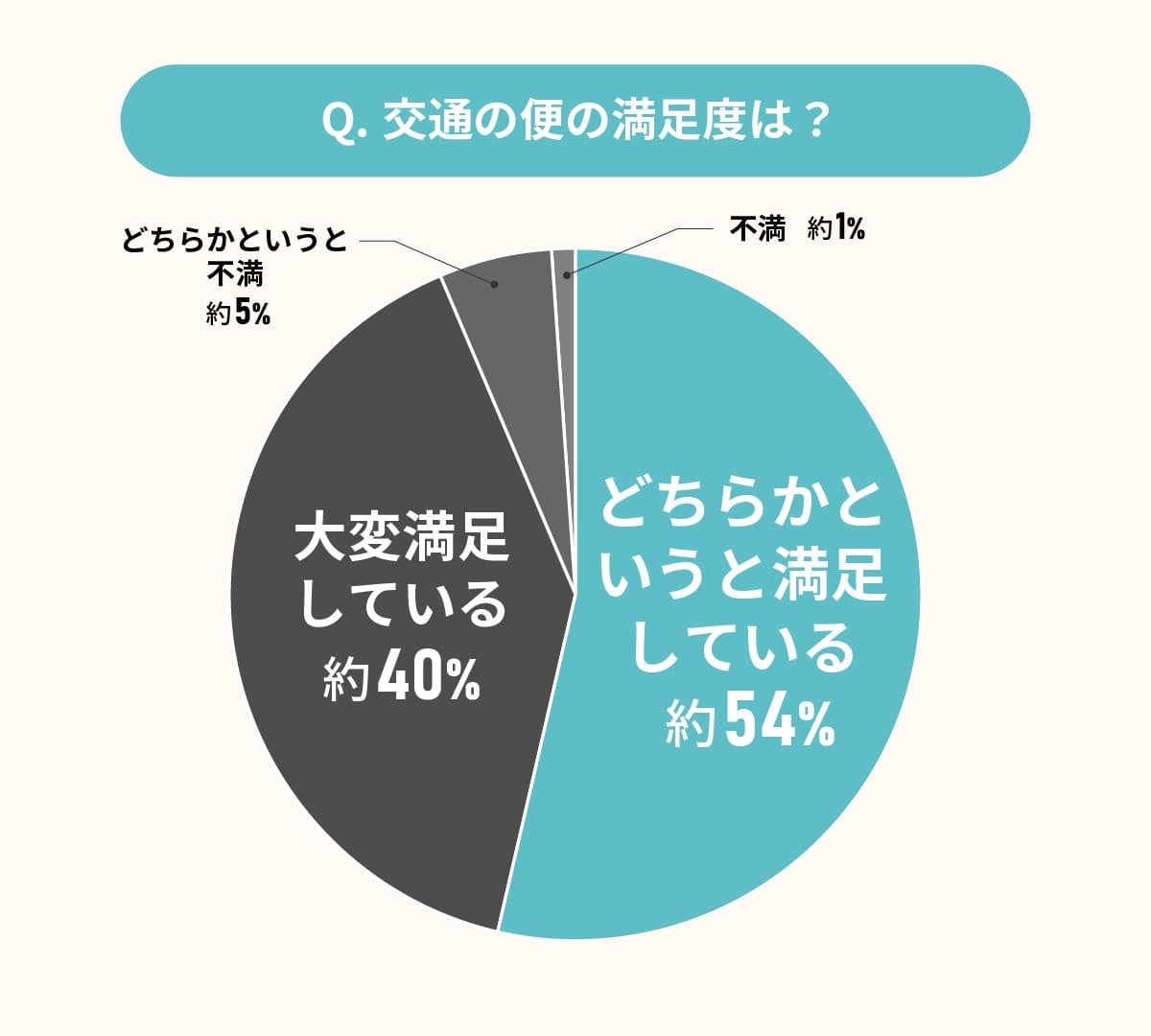 住みやすさの総合評価としては「どちらかというと満足している」が約50%、「大変満足している」が約30%と、約80%の方が満足と回答しています。「都心すぎず田舎すぎず」「交通の弁がよく、商店街も多く、閑静な住宅街もある」など、様々な要素のバランスが良いことが評価されています。