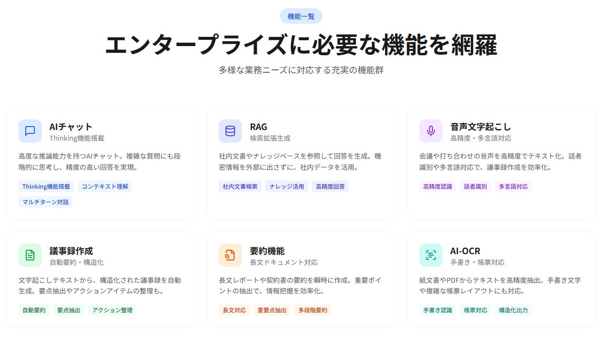 主な機能:生成AIチャット、RAG、AI-OCR、音声文字起こし、要約・議事録作成