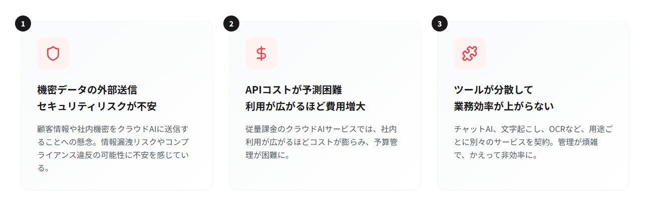 近年、生成AIの業務活用が急速に進む一方で、機密情報・個人情報の外部送信リスクやクラウド型生成AIの利用制限、社内データを活用できないことによる実用性の低さといった理由から、金融機関、官公庁、医療機関、製造業などでは「クラウドAIでは業務に使えない」という企業が増えています。