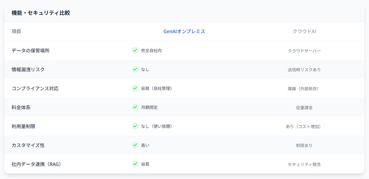 クラウド前提だった生成AIを、RAG・AI-OCR・音声処理まで含めて『完全オンプレミスで一体提供』する点が本サービスの新規性です。