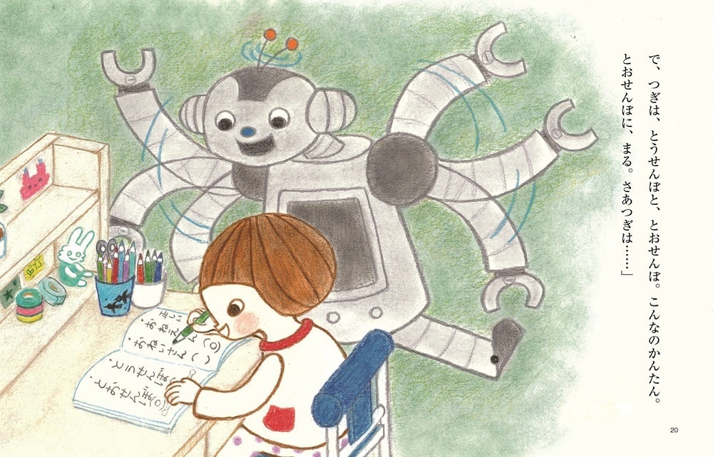 まこちゃんは、おばあちゃんが家に来るたびに買ってくるドリルに嫌気がさして、おばあちゃんが来る日に遊びに出ることにしました。途中で、迷子になって困っている“コトバロボ”というロボットと出会います。