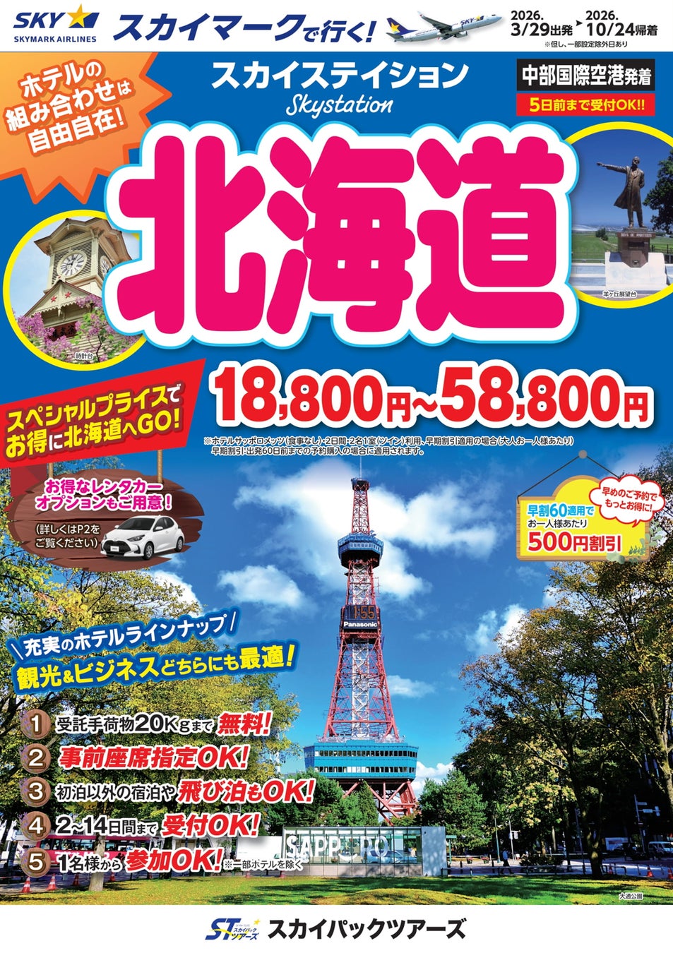 スカイパックツアーズ株式会社(本社:東京都中央区、社長:横山正巳)は、スカイマークを利用した価格固定型のパンフレット旅行商品「スカイステイション 北海道」【中部国際空港発着】(2026年3月29日出発~2026年10月24日帰着)の販売を開始します。スカイマークだけを取り扱う専売店だからできるスペシャルプライス!早めのご予約がお得です。また、オンライン専用のスカイマーク公式ダイナミックパッケージ『たす旅』ではクーポンセール 実施中♪8月から10月の予約が特にお得!