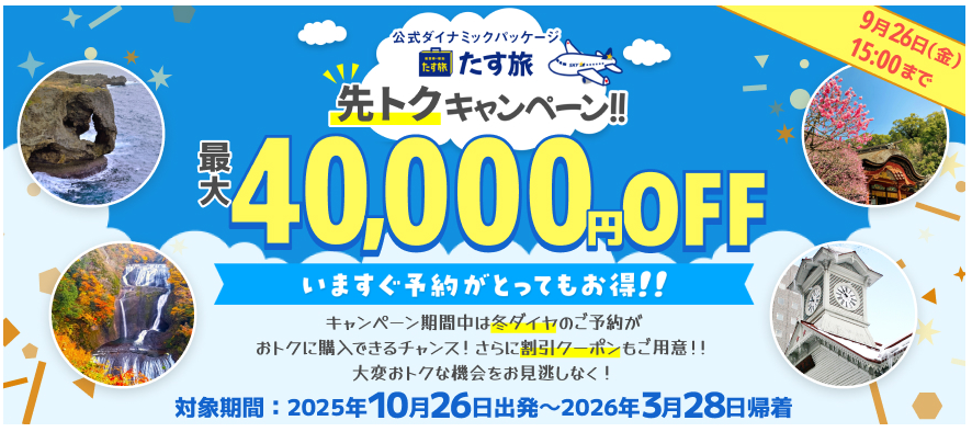 【WEB予約限定】ダイナミックパッケージ『たす旅』にて先トクキャンペーン実施中!最大40,000円引きの期間限定クーポンを使っておトクに旅しよう!お安い航空運賃は早い者勝ち♪今すぐご希望のご出発日でチェック!
