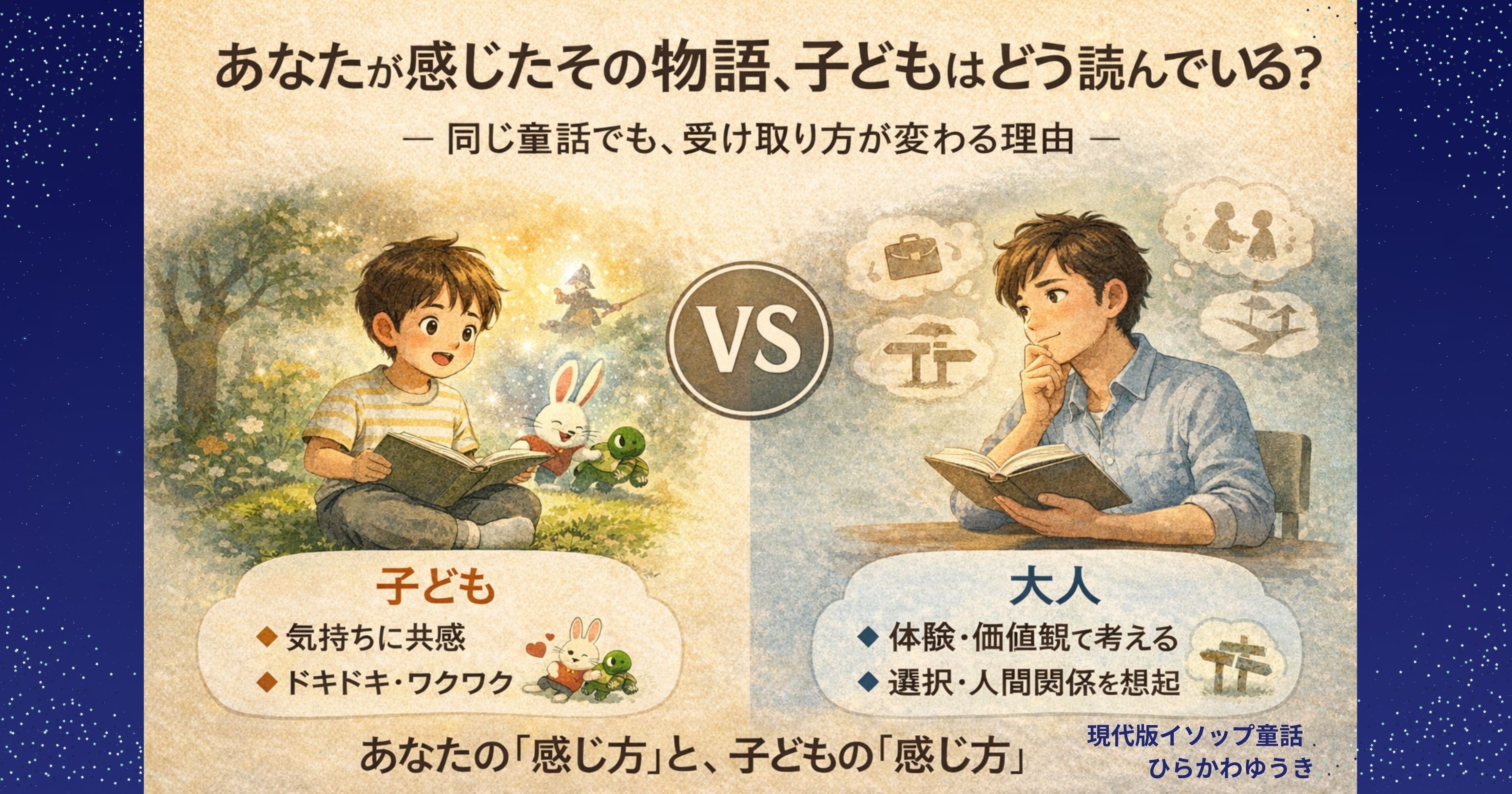 同じ童話を読んでも、子どもと大人では受け取る意味が異なることが多い。心に残る場面や、印象に残る言葉は、年齢や経験によって大きく変化する。知識量の違いだけでは説明できない「感じ方の差」が存在している。