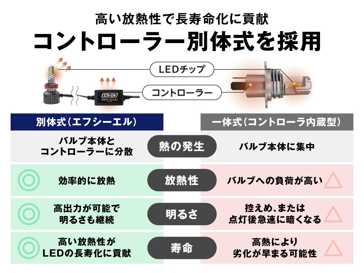 長寿命を支える「別体式」設計:コントローラーをバルブ本体から分けた「別体式」を採用。熱の発生源を分散させることで効率的な放熱を可能にし、高出力を維持しながらLEDの長寿命化に貢献します。