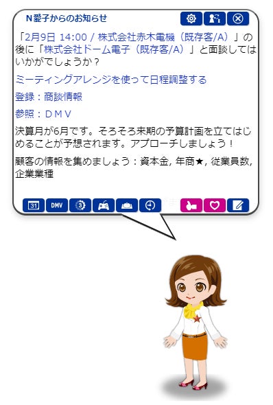 そこで、NIコンサルティングでは、営業支援システム『Sales Force Assistant』に、蓄積された顧客データと営業担当者のスケジュールをAIが解析し、ユーザー専属のAI秘書が商談先を提案する「アポイントアシスト」機能を新たに追加します。
