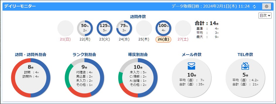 また今回の新バージョンでは、営業担当者の一日の活動をグラフで可視化する「デイリーモニター」も新たに追加します。一日の活動が集約された日報ビューに、当日の商談件数やその顧客ランク別割合などの指標を表示します。これによって、自身の営業活動を定量的に把握でき、営業戦略の現場実行に向けたセルフマネジメントを促進できます。