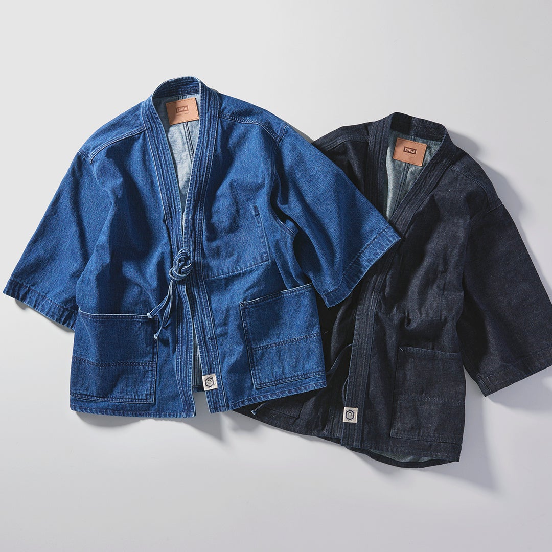 半纏特有の広い袖巾、半端な袖丈、胸ヒモなどのディテールはそのままに、前立て~襟の帯部分には体に沿うような曲線、ポケットにはカバーオールの仕様を踏襲し、日本古来の作業着とワークウェアを掛け合わせた「和洋折衷」 の仕上がり。