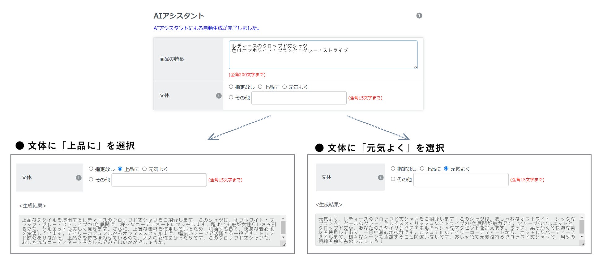 文章のスタイル(文体)を「指定なし・上品に・元気よく・その他(自由入力)」から選択する