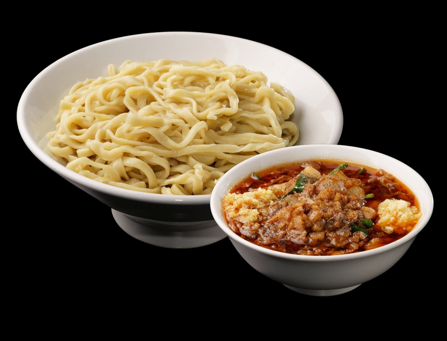 “大盛”の名に恥じぬ「宅麺.com」No.1の麺量400gを誇るボリューム満点なつけ麺。「スタ満ソバ」のジャンクで中毒性の高い味わいはそのままに少し酸味の加わったスープは、麺量を忘れさせるほどに食欲を増進させる。お好みで刻みニンニクやすりおろし生姜を加えることで、店の味をより厳密に再現することが可能。