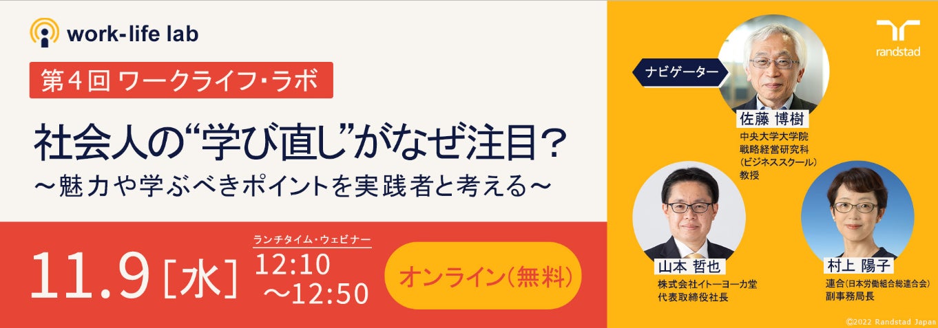 ランスタッド、「ワークライフ・ラボ」第4回はリカレント教育、リスキリング「社会人の“学び直し”がなぜ注目?魅力や学ぶべきポイントを実践者と考える」を11月9日(水)ランチタイムに無料ウェビナー開催。
