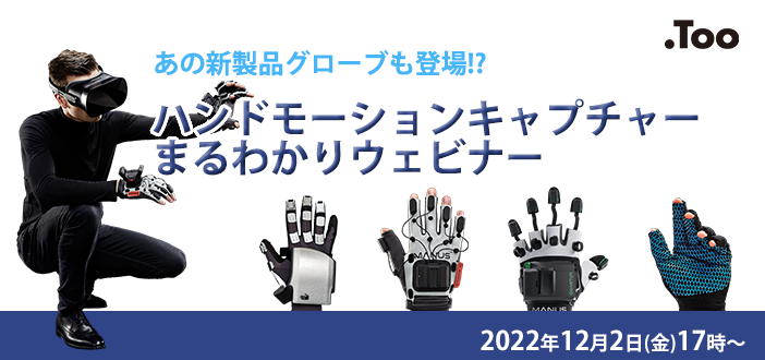 クリエイティブ市場の総合商社・株式会社Too(本社/東京都港区虎ノ門3-4-7、社長/石井剛太、資本金/1億円)は、2022年12月2日(金)にオンラインLIVE配信セミナー「ハンドモーションキャプチャーまるわかりウェビナー」を開催します。