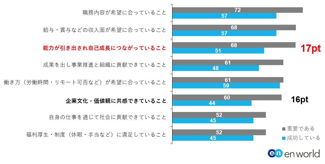 まず転職者側で、「成功している」と回答した割合が「重要である」と回答した割合を大きく下回ったのは、「能力が引き出され、自己成長につながっていること」(17pt差)、次いで「企業文化・価値観に共感できていること」(16pt差)となりました。【図3】