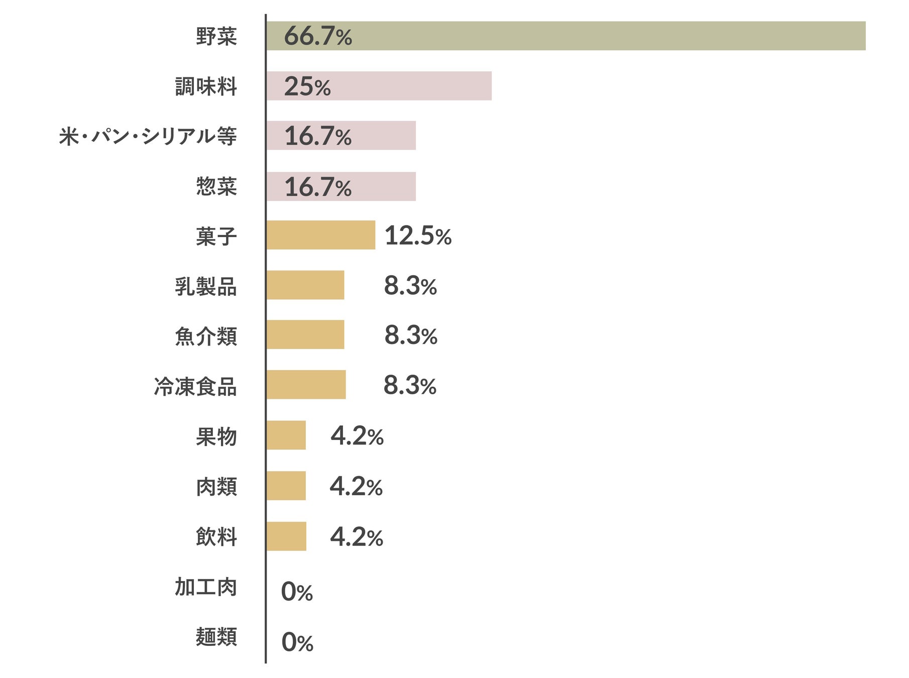 全体の66.7%が回答したのが「野菜」で、他の選択肢より圧倒的に多い結果でした。次いで「調味料(25.0%)」、「米、パン、シリアル等」(16.7%)、「総菜(16.7%)」、などとなりました。逆に回答がゼロだったのは、「加工肉」「麺類」です。