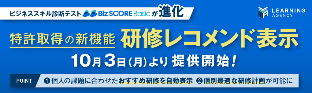 累計13,000社350万人以上の組織開発と人材開発を支援し、複数の業界初サービスを開発する株式会社ラーニングエージェンシー(旧トーマツ イノベーション株式会社、本社 東京都千代田区、代表取締役社長 眞﨑大輔)は、10月3日よりビジネススキル診断テスト「Biz SCORE Basic」の新機能【研修レコメンド表示】を提供開始いたします。これにより、診断テスト受検者が自身のビジネススキルの現状を定量的に把握できるだけでなく、今後どのような研修から取り組み始めるとよいか、具体的に知ることが可能となります。