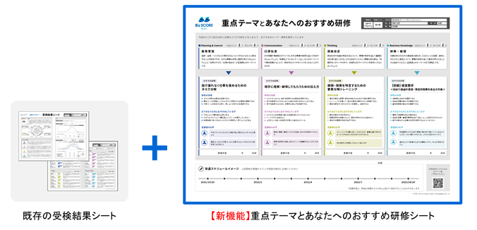 今回の新機能【研修レコメンド表示】が追加されることにより、結果をもとに導き出された重点テーマ、さらにはおすすめ研修も表示され、今後受講すべき研修を一目で確認することが可能となります。また、おすすめ研修の下には受講時期を記入できる仕様になっており、受検結果シートを研修の受講計画表としても活用いただけます。