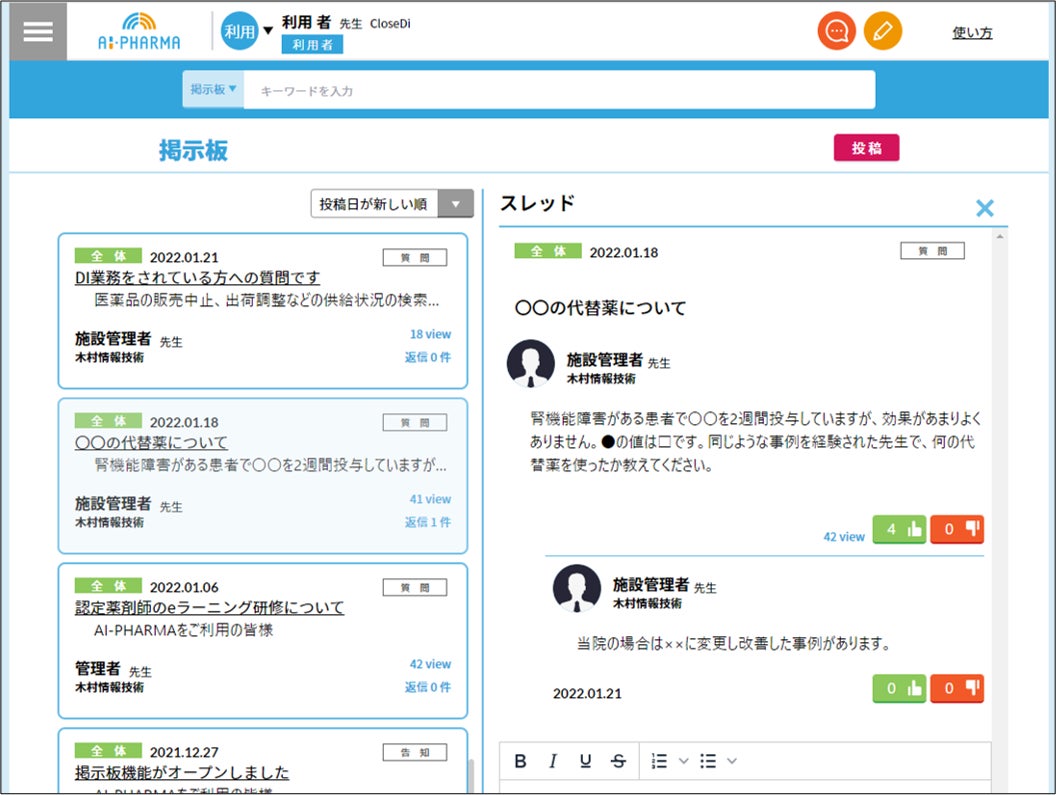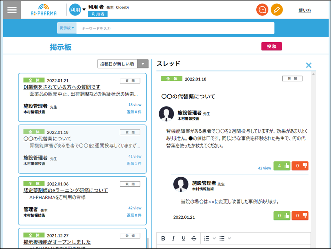・「薬剤師のみの登録制」「コメント機能」「レイティング機能」により、相互評価することで医薬品情報の質の向上を目指す