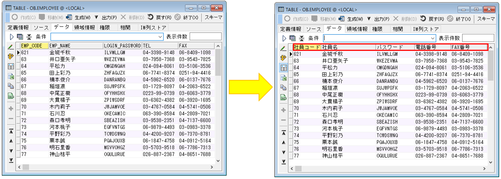 テーブル画面のデータタブにて、列名を列コメントで設定した文字列に切り替える機能を追加しました。例えば、列コメントに列名の日本語訳を設定していた場合、データタブ上で即座に日本語に切り替えることができます。日本語表記になることで誤読による作業ミスを減らし、生産性を向上します。