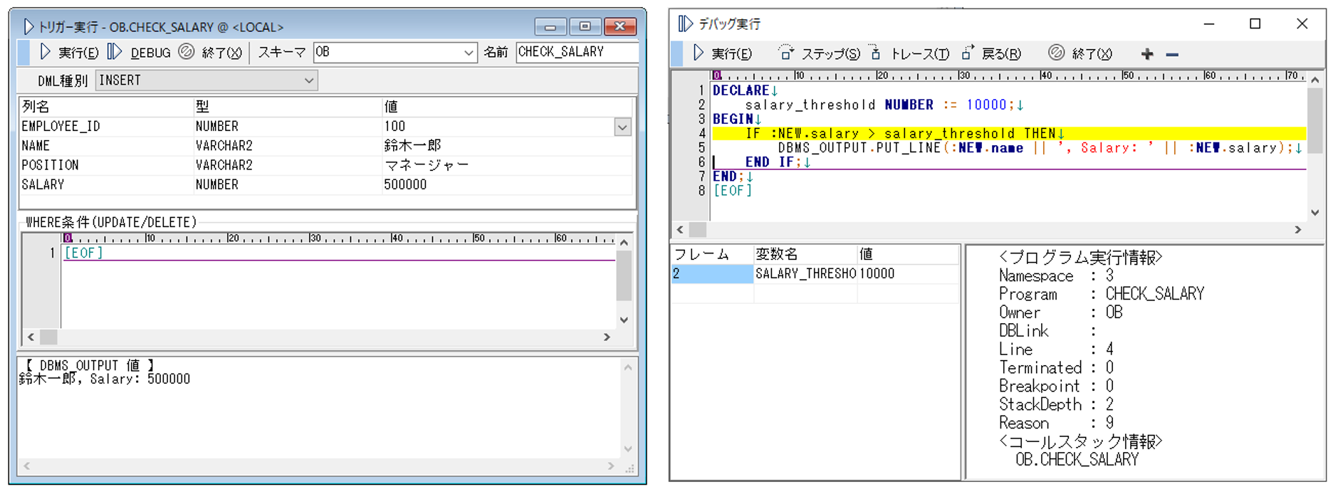 実行画面では、対象テーブルにデータを設定することで即座に実行可能です。また、デバッグ画面ではトリガーのコードを1行ずつトレース実行しながら、細かな動作確認が可能です。
