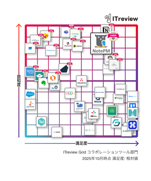 株式会社プロジェクト・モードが提供する、ナレッジ管理SaaS「NotePM ( https://notepm.jp )」は、アイティクラウド株式会社運営のIT製品レビューサイト「ITreview」において、満足度・認知度ともに優れた製品であると評価され、「ITreview Grid Award 2025 Fall」のマニュアル作成ツール部門、コラボレーションツール部門、グループウェア部門、Web社内報部門の4部門で「Leader」を受賞いたしました。