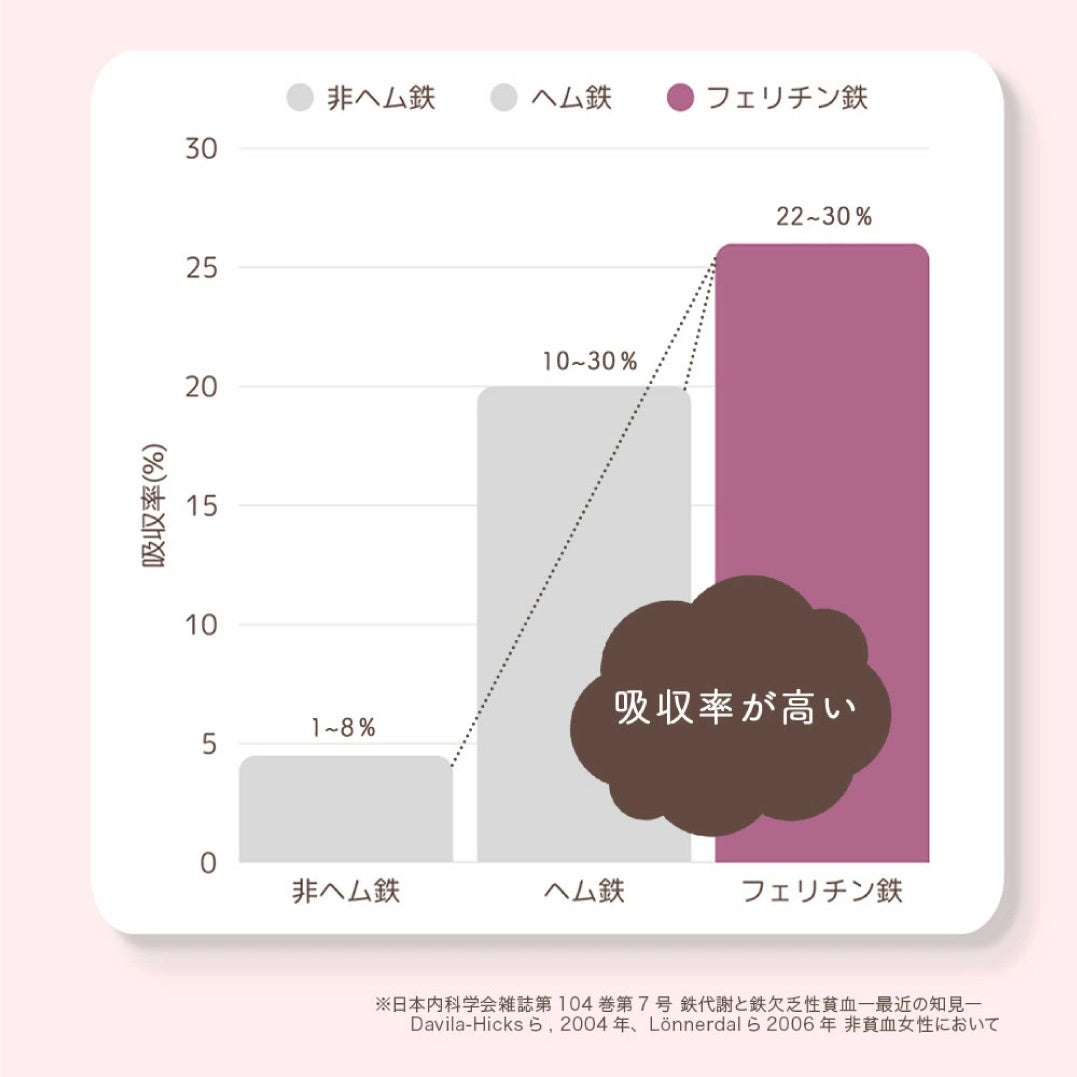 フェリチン鉄は22-30%と吸収率が高く、高い吸収率を誇るヘム鉄と同様、効率よく鉄を摂取することができます。