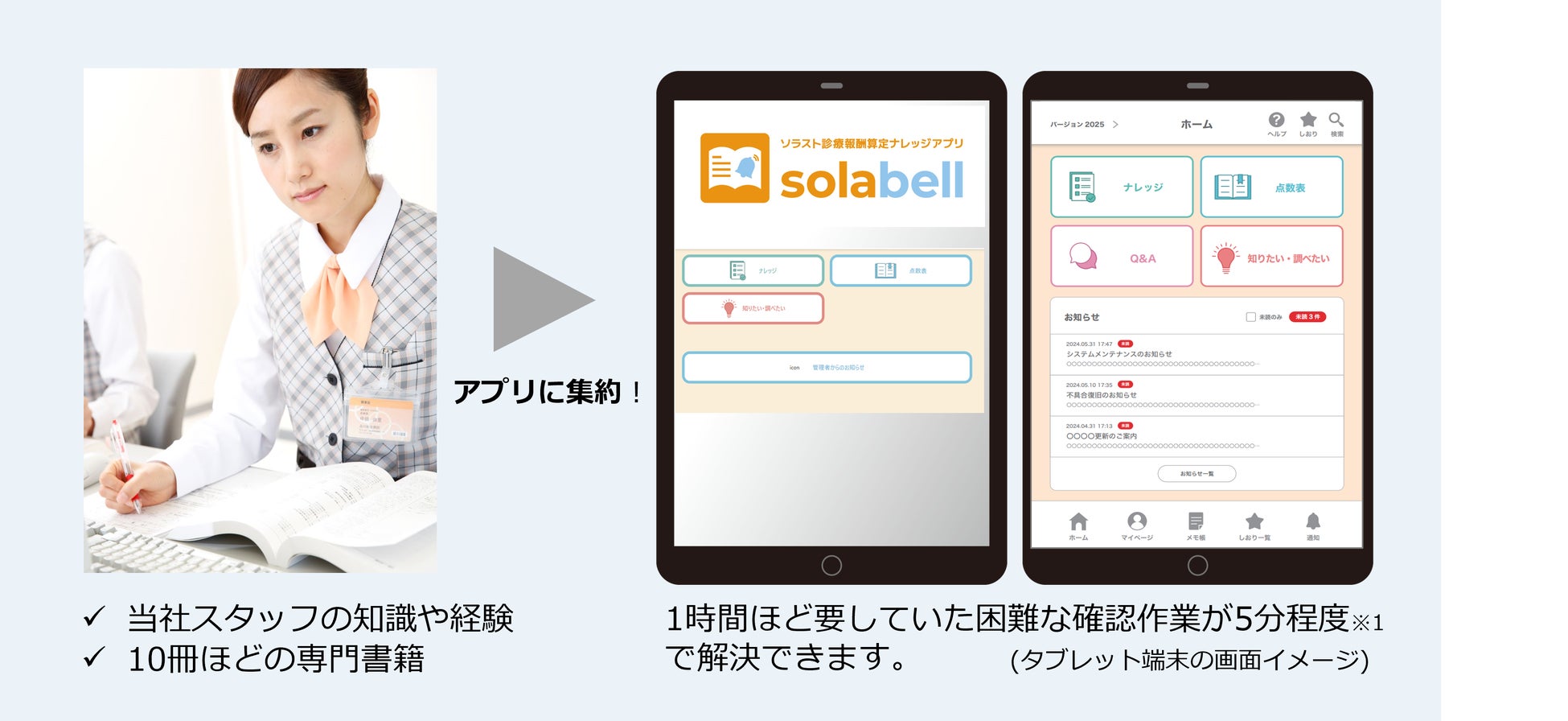 そこで、このたび当社が開発※2した<ソラスト診療報酬算定ナレッジアプリ「solabell」>は、診療報酬請求に関する多彩な情報と当社のノウハウをアプリに集約することにより、複雑な診療報酬請求業務を高精度で行えるように設計しました。
