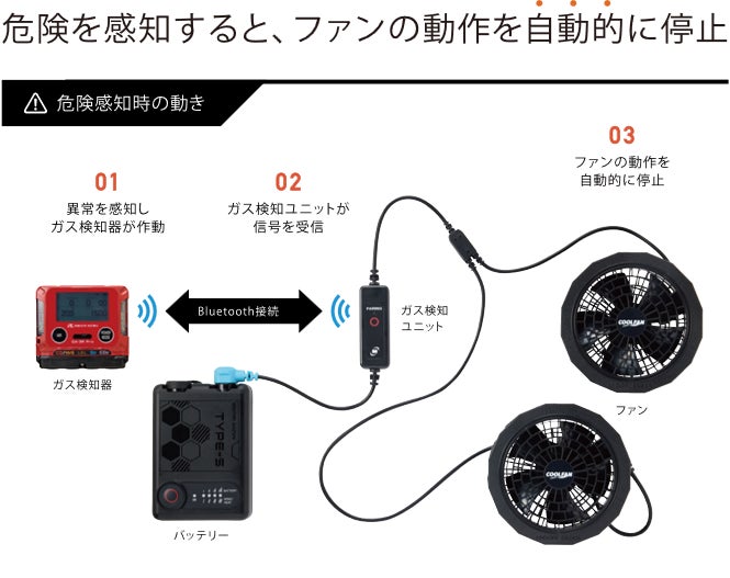 本製品は、理研計器の国内初Bluetooth搭載ガス検知器「GX-3R Pro」と当社のファン付き作業服「クールファン」の技術を融合させたものです。