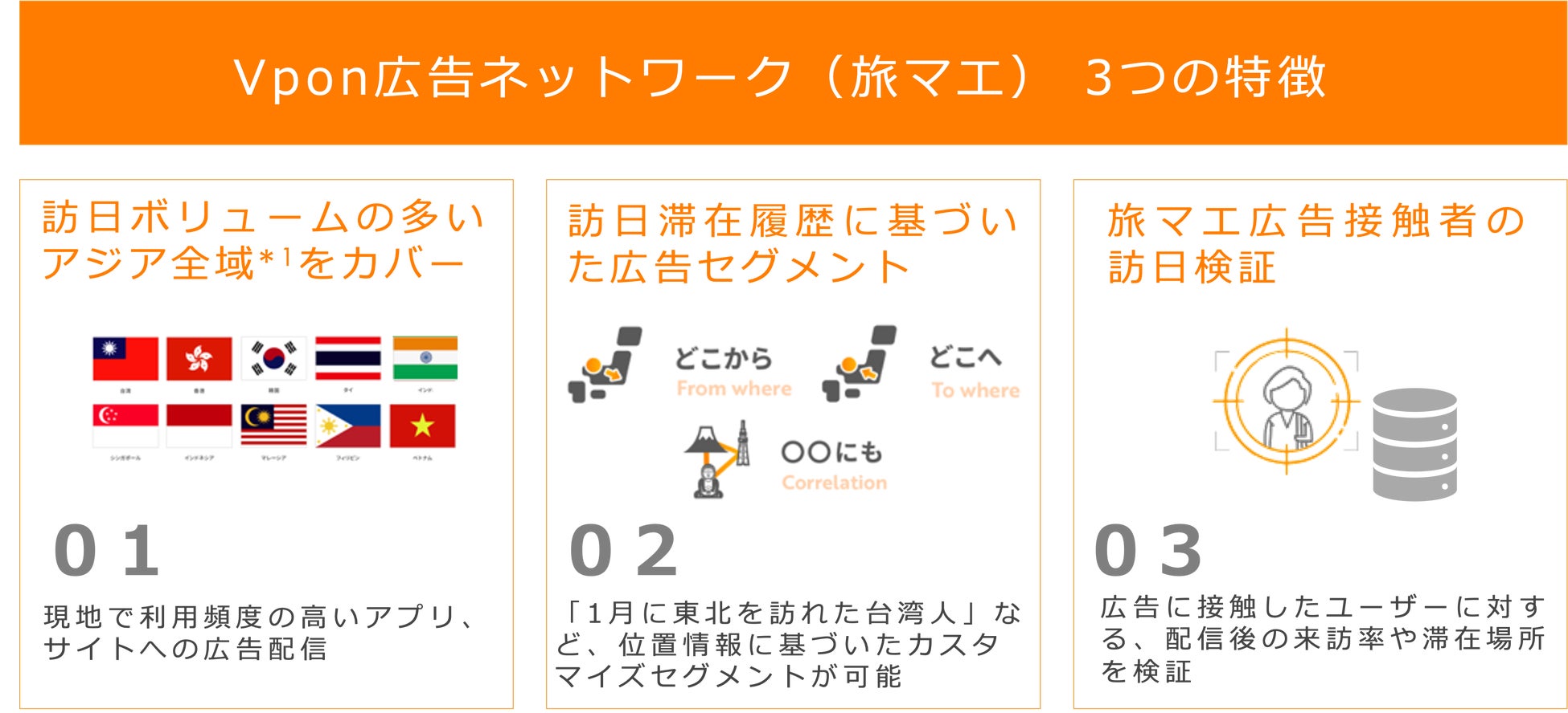 Vponはアジア全域にわたるモバイル広告プラットフォームを展開し、これまでに訪日客および潜在的な訪日客を対象に、「旅マエ」「旅ナカ」モバイル広告配信サービスを提供してまいりました。