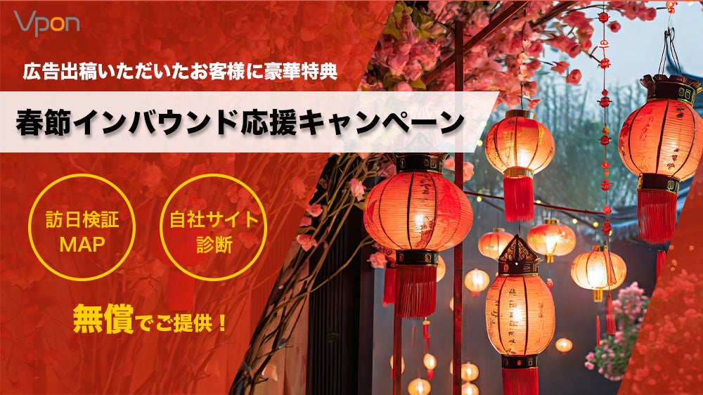 日本の魅力をデータ&デジタルの力で世界へ届けるVpon JAPAN株式会社(本社:東京都新宿区、代表取締役社長:篠原 好孝、以下Vpon JAPAN)は、観光業をはじめとするインバウンド消費にフォーカスし、中華圏の人々の旅行需要や購買意欲が急増する春節(2024年2月10日〜2月17日)に向けて、2024年1月15日までにVpon広告ネットワーク『旅マエ』のお申し込みをいただいたお客様に対して、効果を最大化させるための豪華特典を無償でご提供する「春節インバウンド応援キャンペーン」を実施いたします。