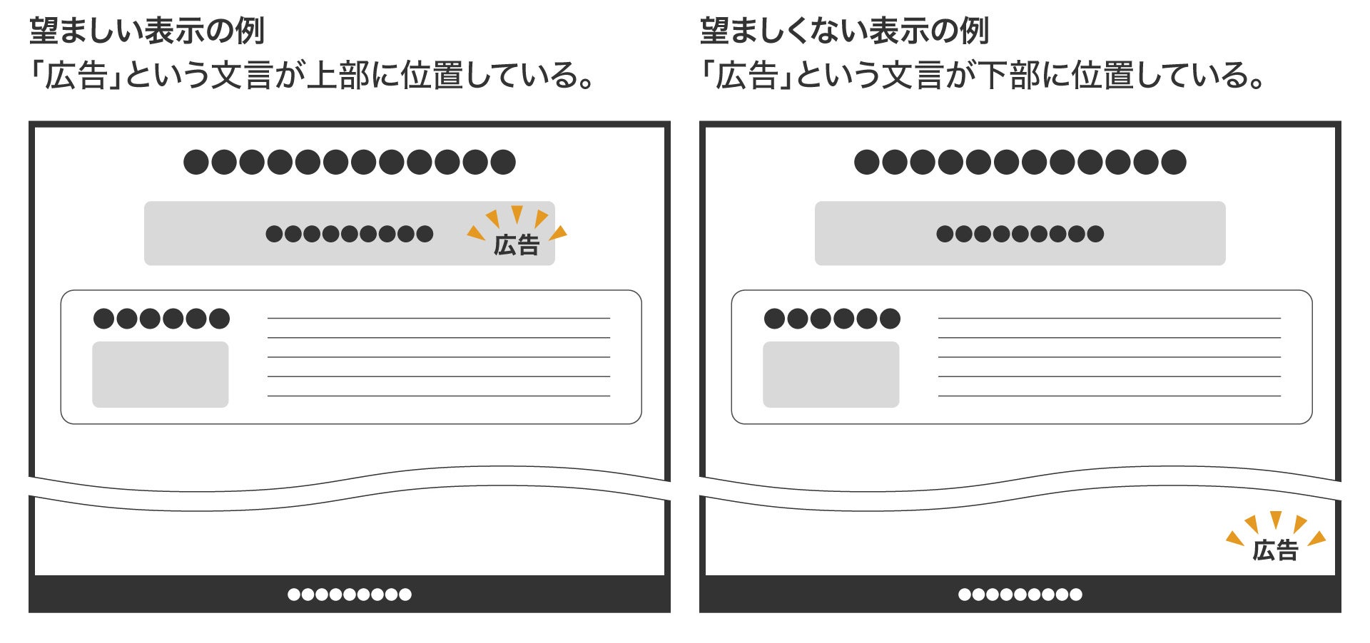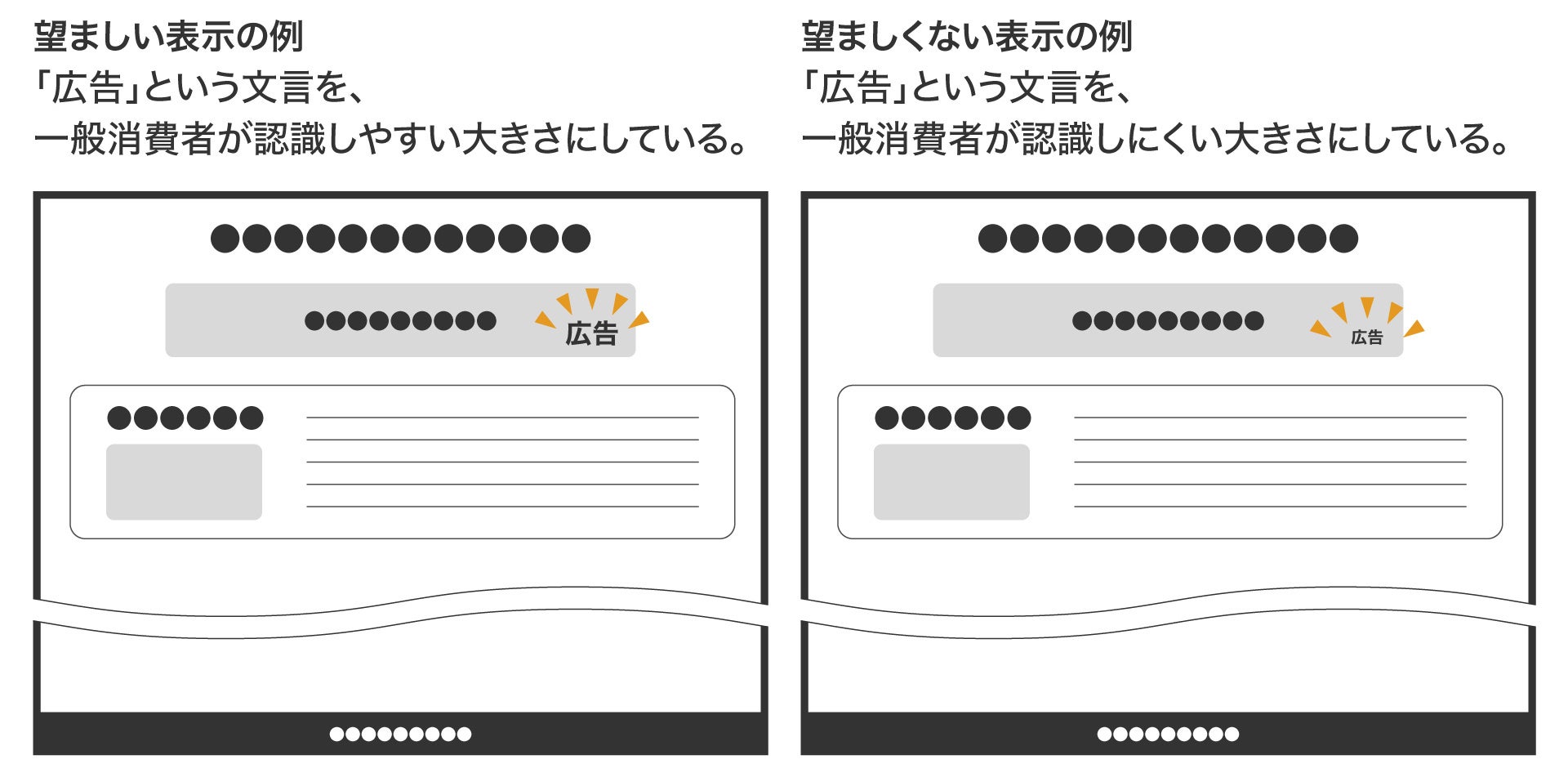 すでに、2022年6月29日、消費者庁より、『「事業者が講ずべき景品類の提供及び表示の管理上の措置についての指針」の一部改正案及び「インターネット消費者取引に係る広告表示に関する景品表示法上の問題点及び留意事項」の一部改定案に関する意見募集の結果の公示について』が公表され、アフィリエイト広告のリンクがあるサイトについてはガイドラインが設けられています。以下、「(1)アフィリエイトプログラムを利用した広告を行う事業者の表示であることの明示」から抜粋です。「広告」や「PR」という文言の掲載について、具体的には、イラスト付きで紹介されています。