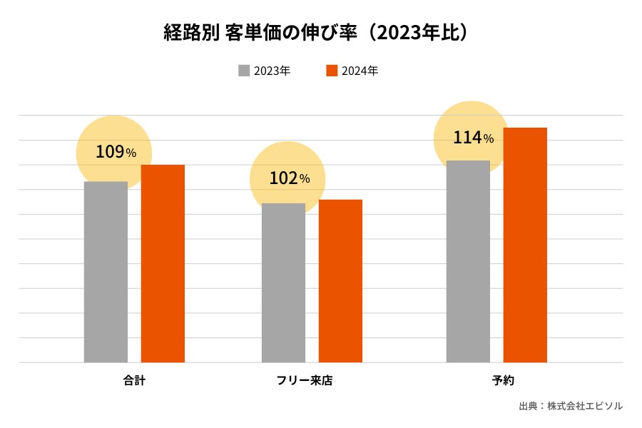 2. 客単価は総合で109%に上昇。特に予約経由の客単価が114%と大きく成長