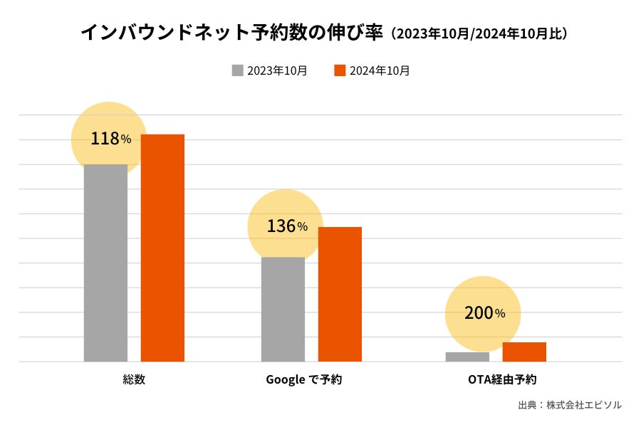3. インバウンド予約は118%と顕著に増加し過去最多の予約総数に、「Google で予約」は136%、