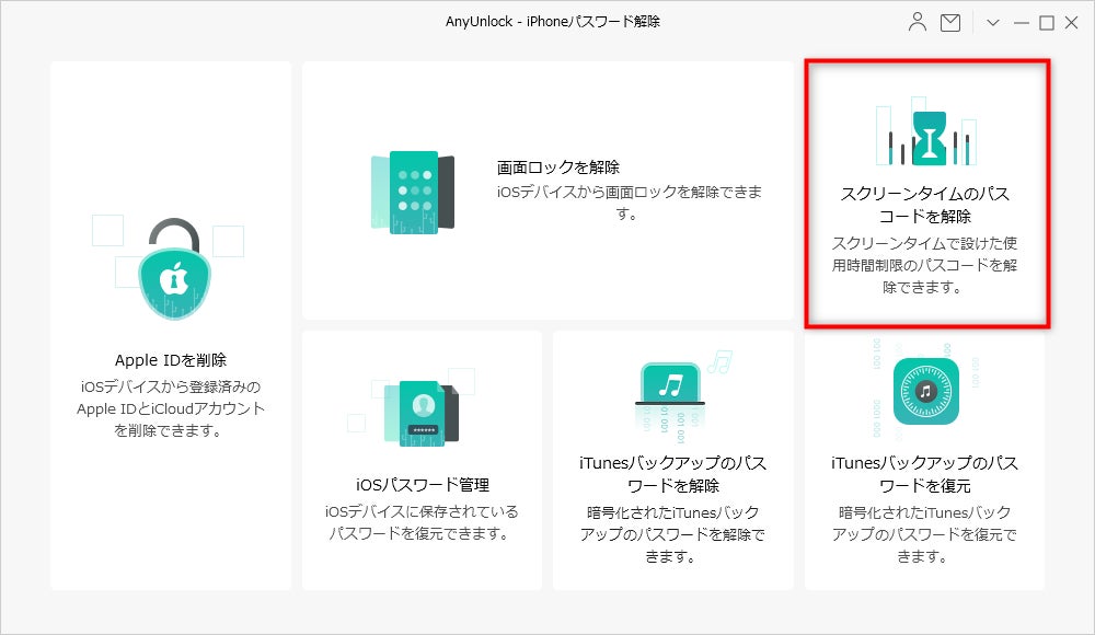 ステップ1、パソコンでAnyUnlockを起動して、画面の「スクリーンタイムのパスコードを解除」をタップしてください。