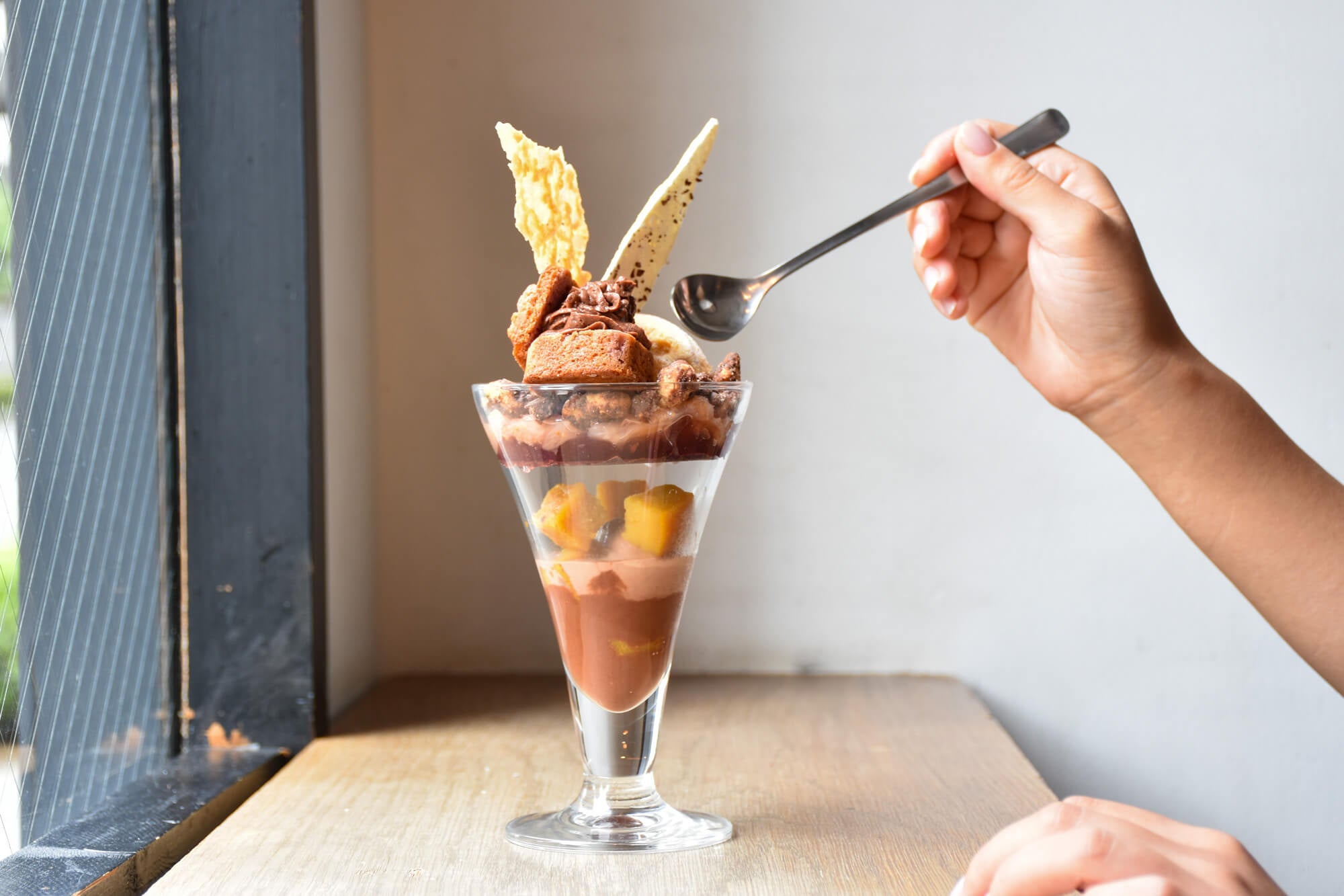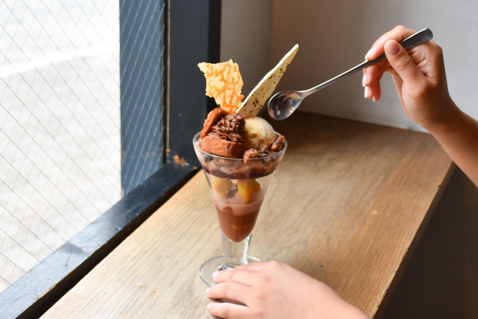 「Bean to Bar チョコレートパフェ -CACAO JOURNEY-」は、富ヶ谷本店のイートインメニューとして通年でご提供中の、香り豊かな5カ国のカカオを使った7つのチョコレートパーツで世界を巡るように楽しむBean to Barチョコレート専門店ならではのパフェです。シーズンごとに、季節のフルーツや素材と合わせてご提供しています。