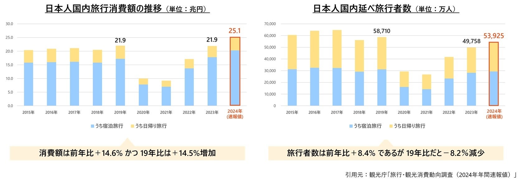 観光庁が発表した「旅行・観光消費動向調査(2024年年間速報値)」(図1)によると、2024年における日本人の国内旅行消費額が過去最高の25兆1175億円(前年比14.6%増、19年比14.5%増)を記録。一方で、同年の日本人国内延べ旅行者数は、5億3925万人(前年比8.4%増、19年比8.2%減)となり、コロナ禍前の9割程度まで旅行者数が回復しているものの、消費額ほど伸長していないことがうかがえます。