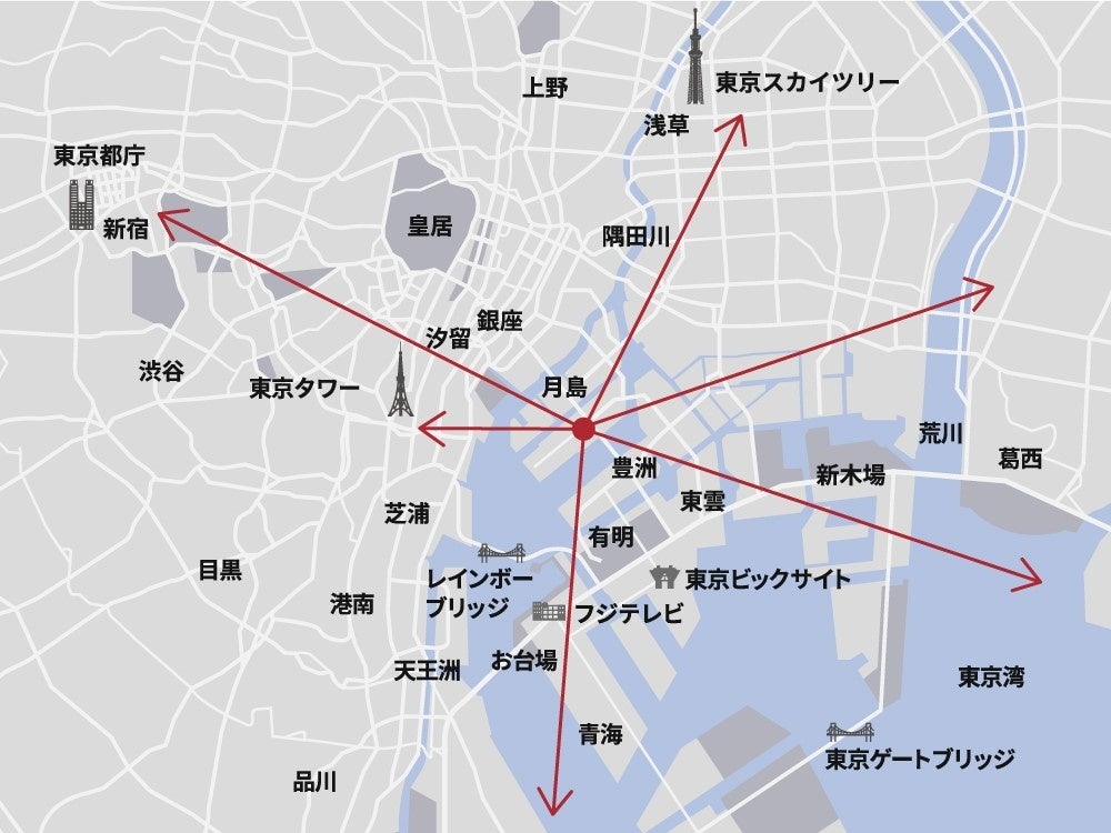 晴海エリアは主要な観光地やビジネス都市の集まる東京の中央に当たる場所に位置し、どのエリアへもバスや電車でのアクセスが便利な立地となっており、旅行時間を効率的に活用いただけます。