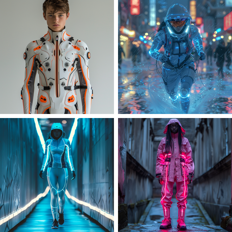 未来の技術とファッショントレンドを融合しながらも、革新的で機能的なスポーツウェアを画像生成AIを使ってデザインしていただきます