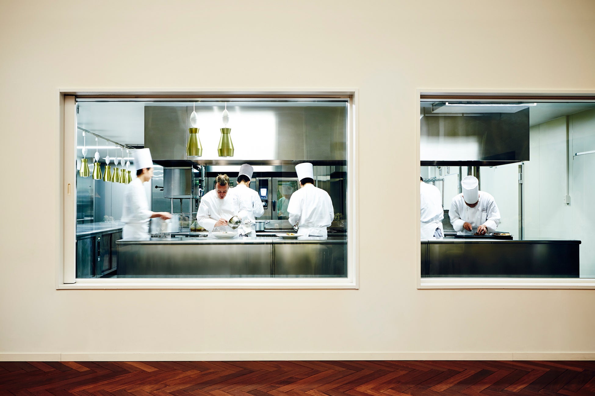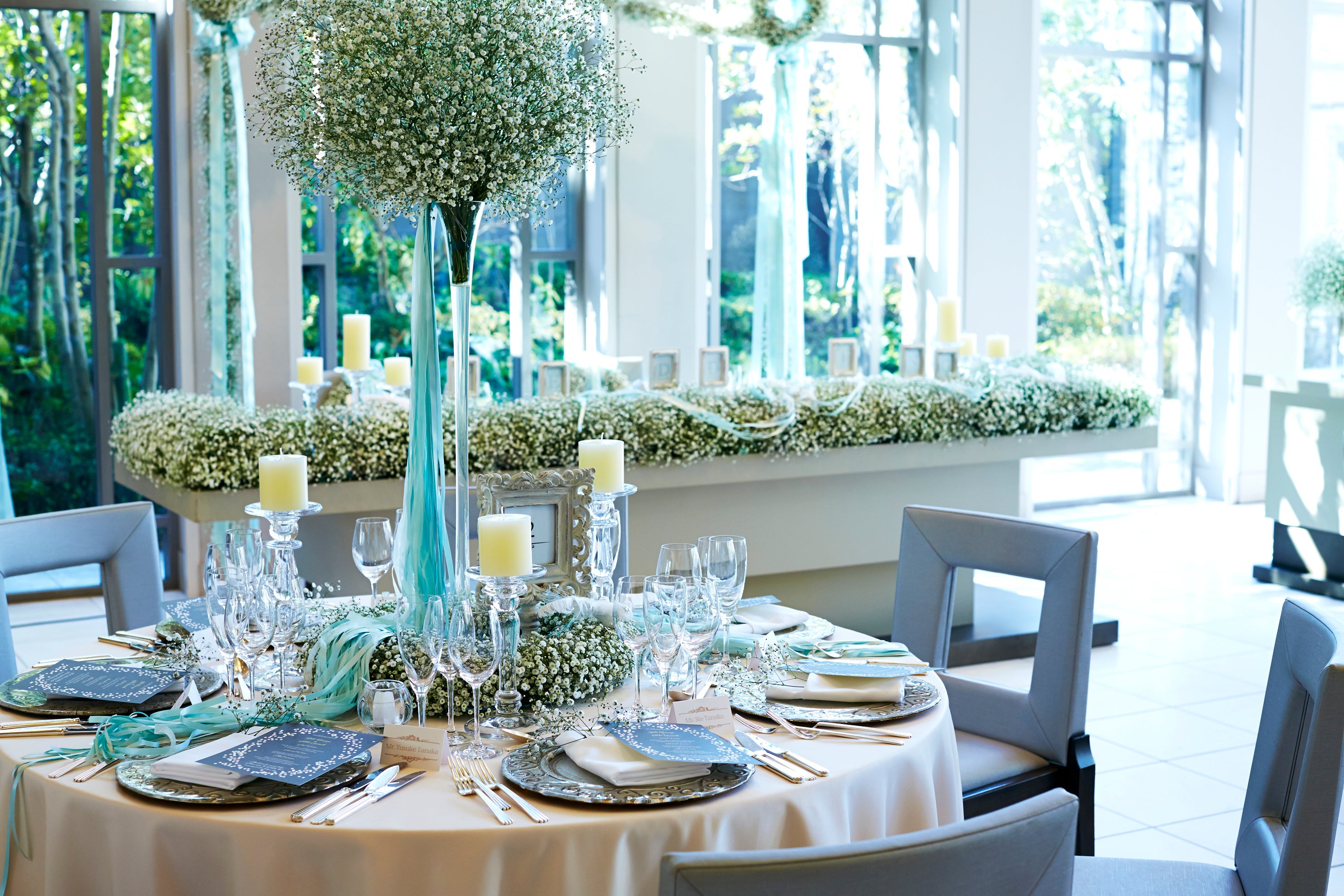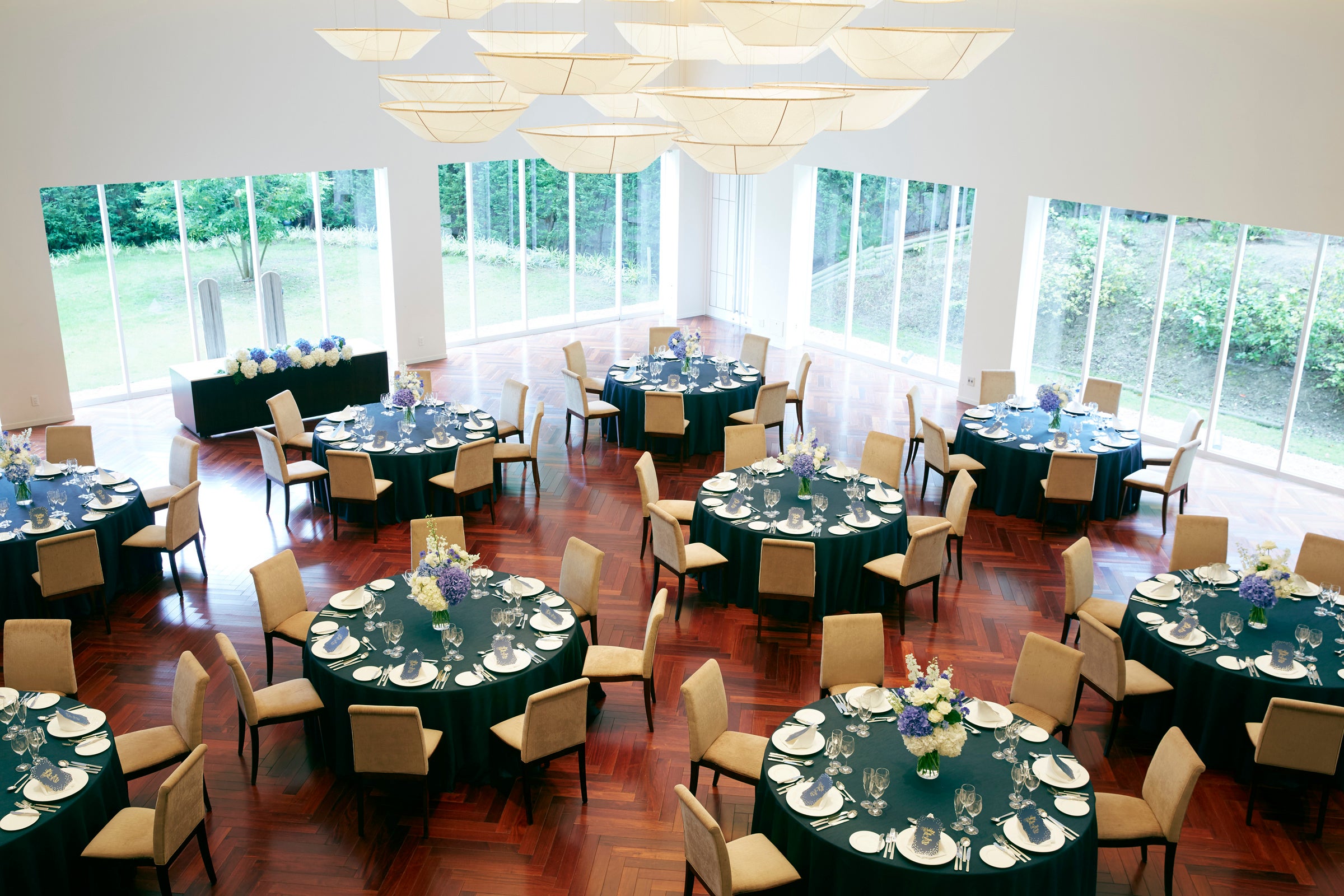 光や水の輝き、鳥のさえずりが聞こえる森の中の別邸。ホテルのホスピタリティはそのままに、会場360°を巡る迫力ある映像や洗練されたシェフの手捌きが愉しめるショーキッチンを備えたパーティスペースです。