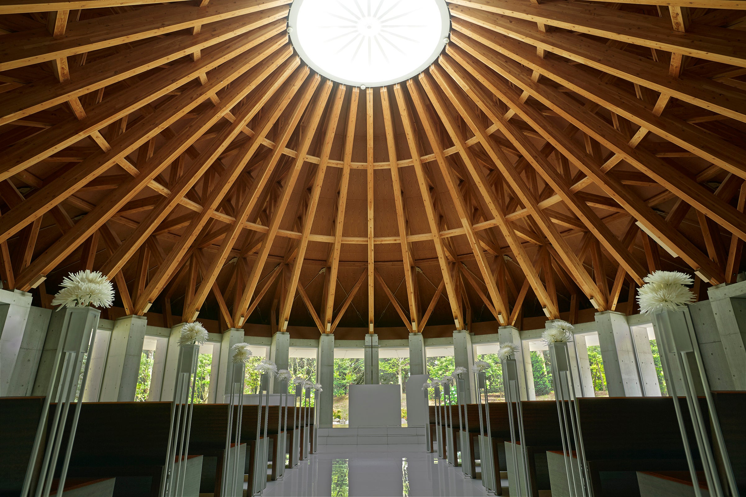 デザイナー・野井成正 氏が手がけた、番傘のような木組みの天井が美しい芸術的なチャペル。窓から見える森が一体となった開放的な空間に、心を解きほぐすように檜の香りが漂います。