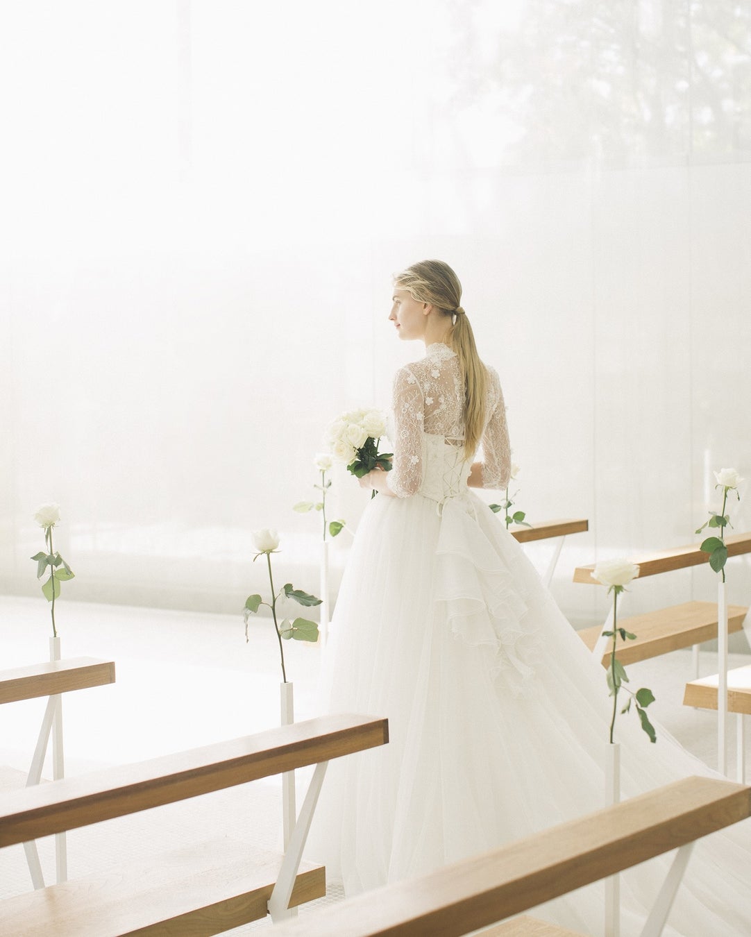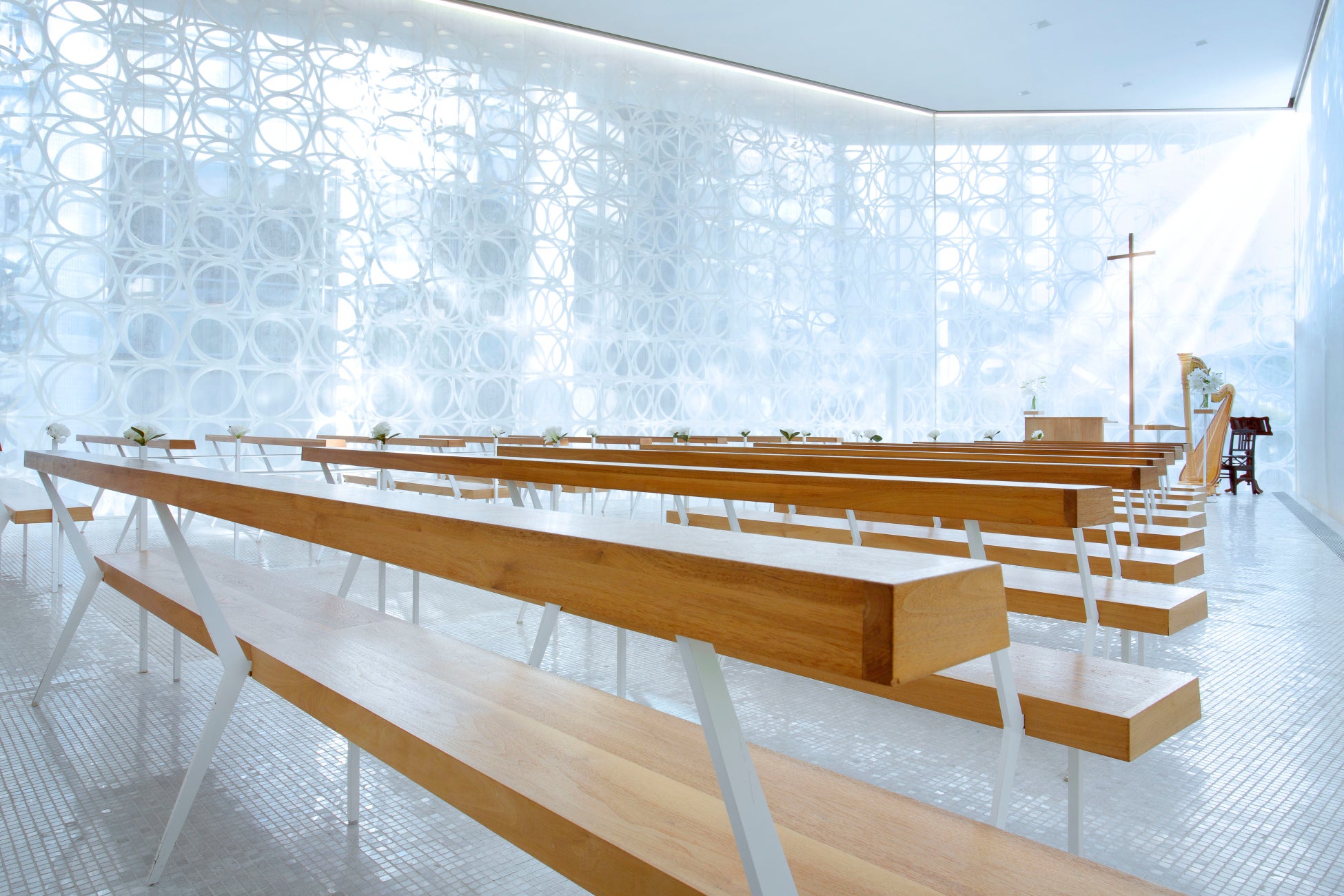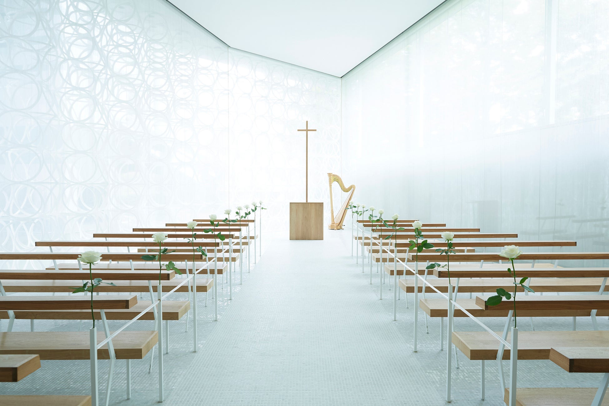 立体的に美しく配置された約1500個もの直径60㎝の無数の白いリングが屋根を支える芸術的なチャペル。リングの内側には白いオーガンジーが施され、自然の光が優しく差し込みます。