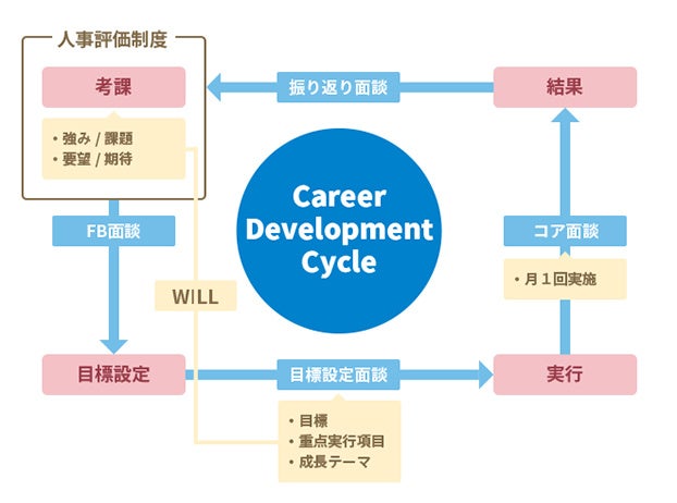 キュービックにとって人事評価制度は、“査定のためのツール”ではなく“成長を促すためのツール”。「どんな強みを活かして目標を達成するか」「その課題を乗り越えるためにはどんな成長テーマが必要か」ということを、人事評価制度を通じて会社・上司・本人が一緒になって考えています。なお、インターン専用の人事評価制度も設けています。3段階の等級別に役割を定め、四半期ごとに評価を実施し、報酬を連動。業績に応じて賞与も支給しています。