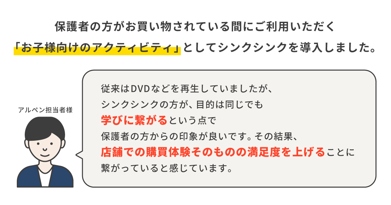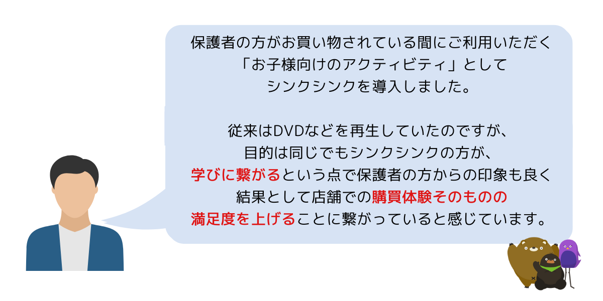 これまでのエンドユーザー向けサービスの開発で培った知見を活かし、「シンクシンクがあるなら、あのお店に行こう!」と保護者やお子様に感じて頂けるサービスにしていきます。