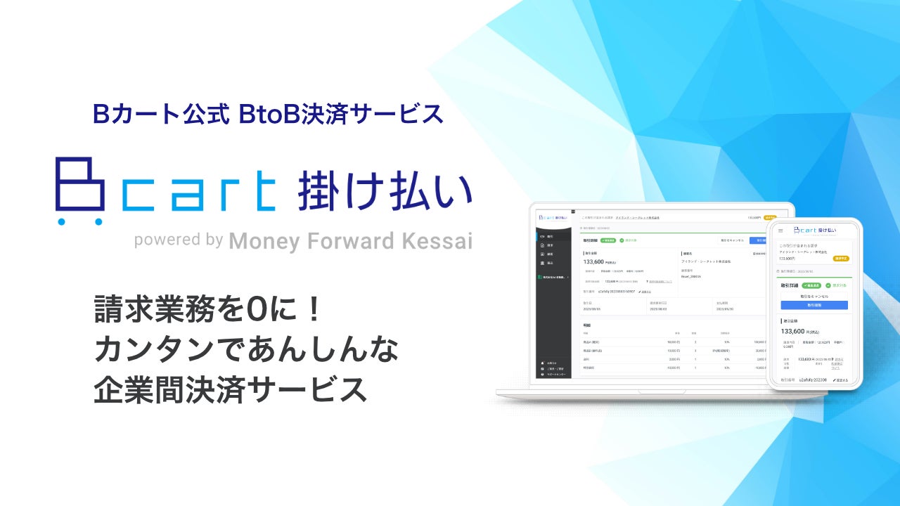 この度、企業の与信管理から請求書発行、代金回収までの決済業務を一括して代行する企業間後払い決済・請求代行サービス『マネーフォワード ケッサイ』を提供するマネーフォワードケッサイ株式会社と協業し、『マネーフォワード ケッサイ』のサービス基盤を活用した『Bカート掛け払い powered by Money Forward Kessai』の提供を開始いたしました。『Bカート』を利用する企業を対象に展開し、利用企業が運営するECサイト上で発生する請求業務や掛売り決済の効率化を実現します。なお、インボイス制度にも対応しています。