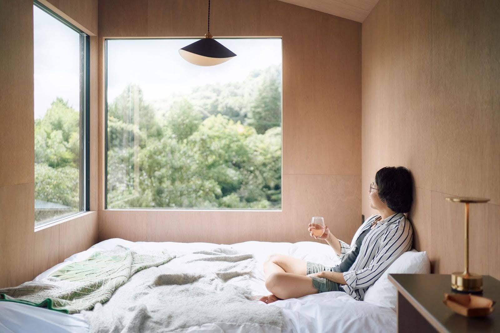 ベッドスペースとリビングスペースを確保した、ゆったりと寛ぐことのできる客室です。2名で広々と使用するのはもちろん、ファミリーでも快適に利用できます。風景を切り取る大きな窓から見える景色を眺めながら大切な人と語り合ったり、地元の新鮮な食材で料理を愉しんだり、思い思いに過ごせます。