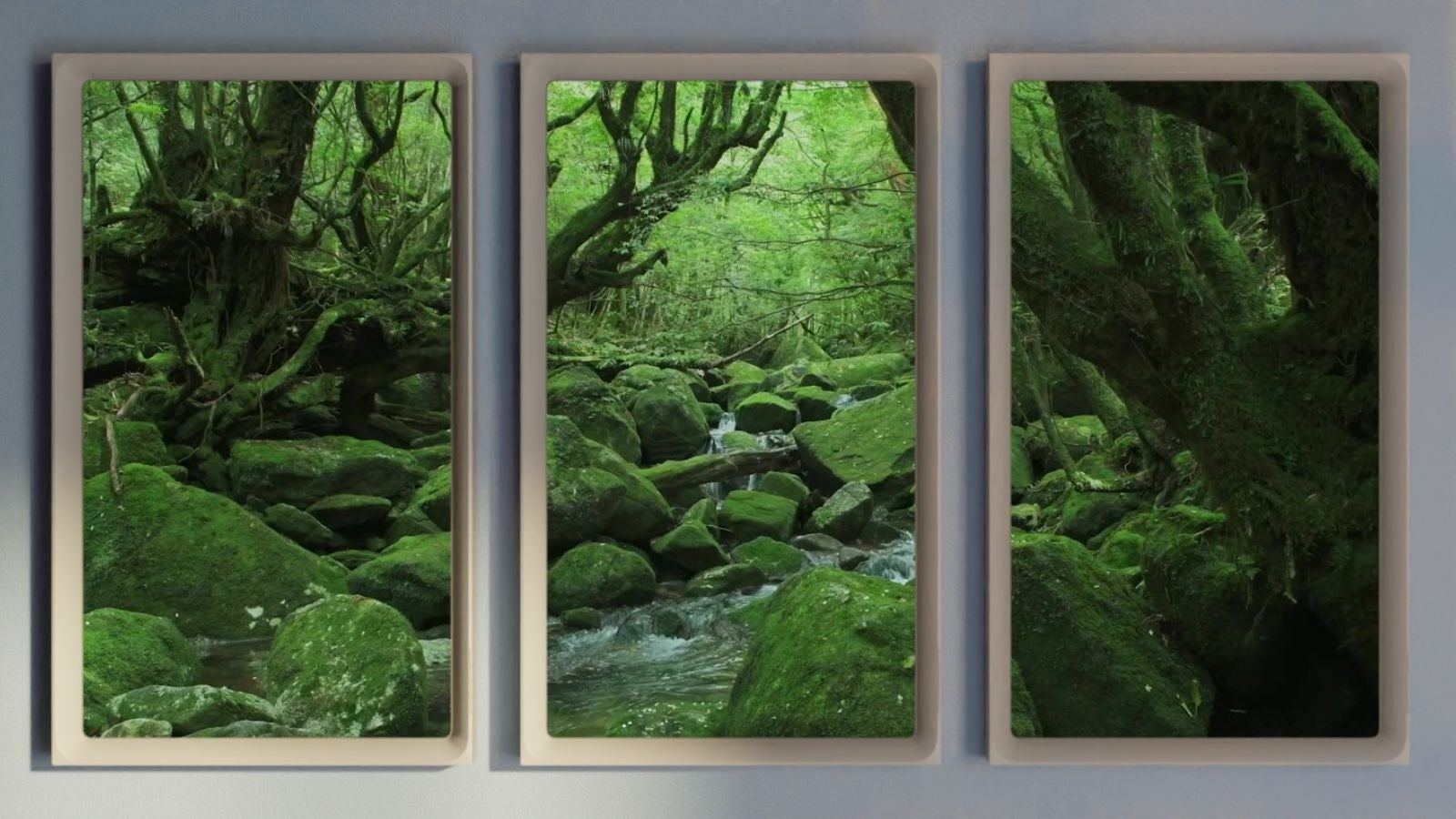 壁にかけるだけで、リビングや仕事部屋から世界中の風景を楽しむことができ、アイスランドのオーロラ、北海道の氷河、軽井沢の雪景色、モルディブの海中など、実際にその場にいるような臨場感あふれる映像と音で、涼しさを味わうことができます