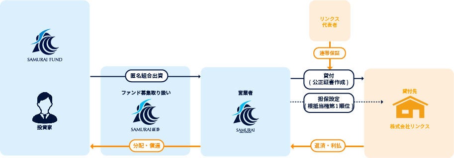 このファンドは、営業者であるSAMURAI ASSET FINANCE(以下、「営業者」)株式会社が株式会社リンクス(以下、「貸付先」)に対して実行した1億円の貸付(以下、「本件貸付」)に対するバックファイナンスをおこないます。