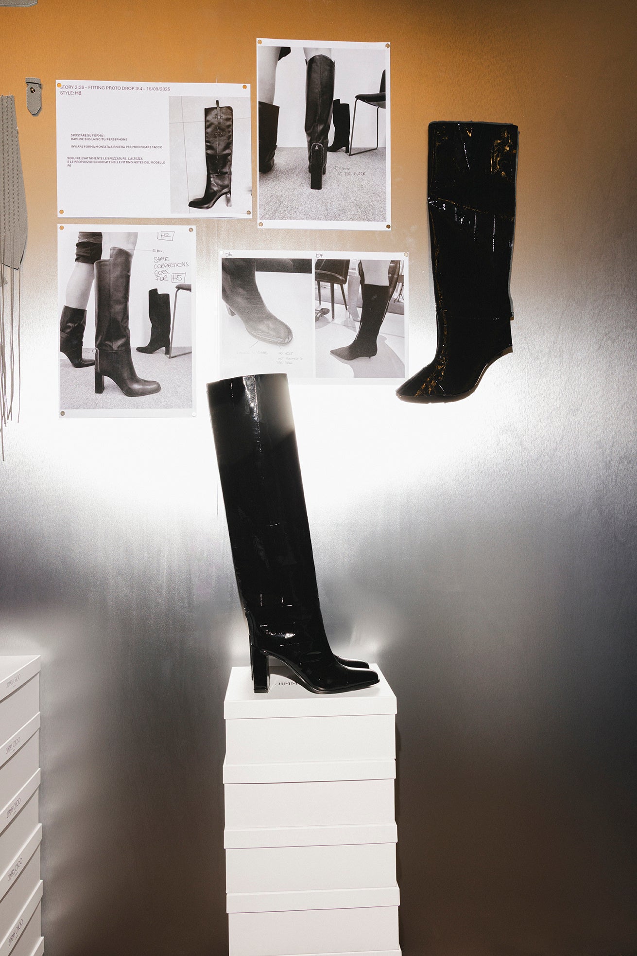 コレクションはミラノ・ファッションウィークにて、Sandra Choiのロンドンデザインスタジオを再解釈したマルチルームのセットで発表されました。1996年のブランド設立以来デザインを監修してきたSandra Choiにとって、この空間はコレクション制作の舞台裏―すなわちJIMMY CHOOが生み出される過程―を意図的に表現した物語の舞台です。